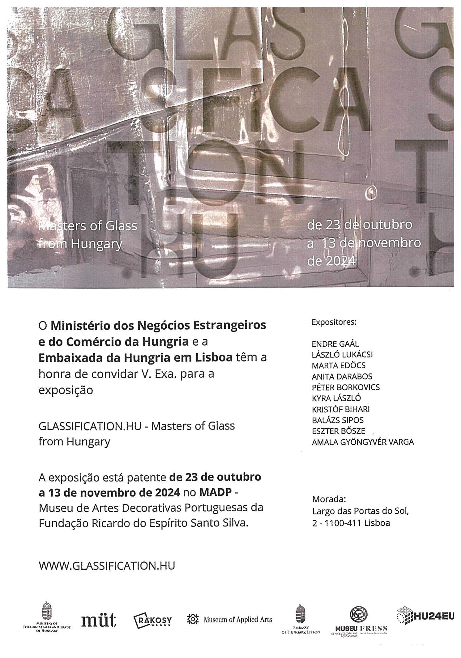 Em colaboração com a Embaixada da Hungria em Portugal e no âmbito do 50º aniversário do restabelecimento das relações diplomáticas entre Portugal e a Hungria, e ainda, no âmbito da Presidência rotativa da Hungria no Conselho da União Europeia, a FRESS acolhe a exposição Glassification, a partir de 23 de outubro, com obras representativas da criação contemporânea decorativa em vidro da Hungria.