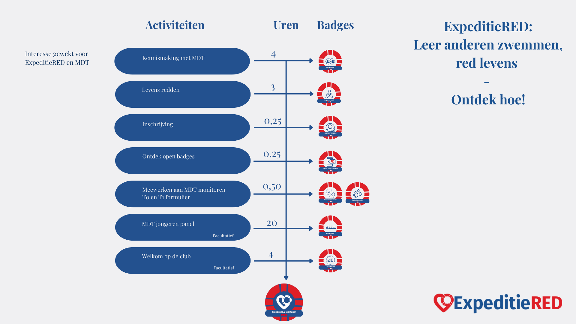 - The workshop 'Introduction to MDT.' This is the first mandatory workshop organized by ExpeditieRED. We'll discuss how MDT works and what you can do as a volunteer to teach children and adults how to swim and ensure they keep swimming. Upon completion of this workshop, you'll receive a badge.