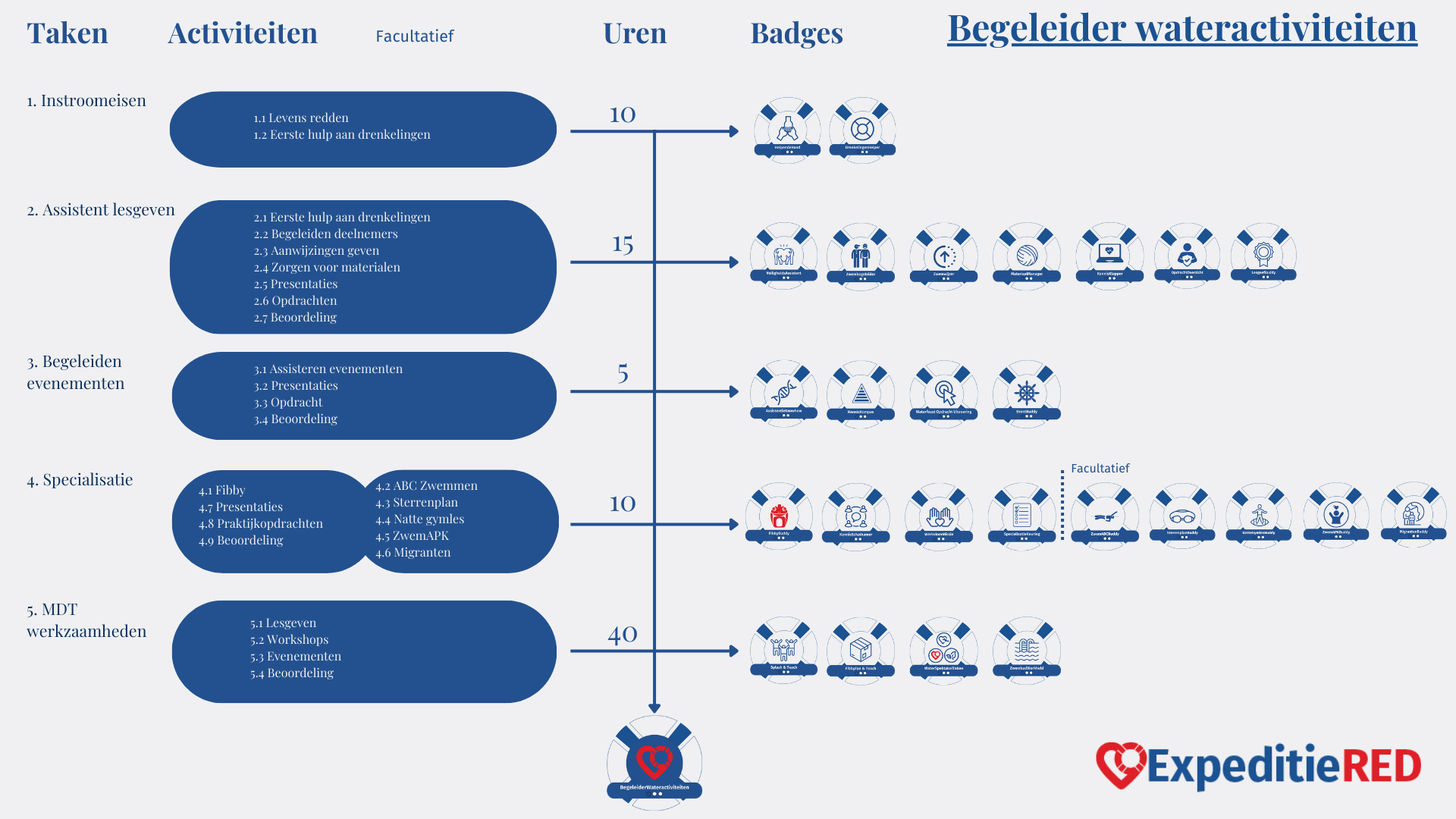 Om begeleider te worden moet je ouder zijn dan 12 jaar. We leiden je goed op. We behandelen wat basistheorie en passen dat onder toezicht toe. Je bent hier ongeveer 25 uur mee bezig. Verder moet je de playlist: ‘ExpeditieRED: Leer anderen zwemmen, red levens - Ontdek hoe!’ hebben gevolgd. Je hebt de bijbehorende badges gekregen, die tellen voor 10 uur. Dat betekent dat je in een half jaar tijd nog 45 uur actief bent in de door jouw gekozen werkzaamheden.