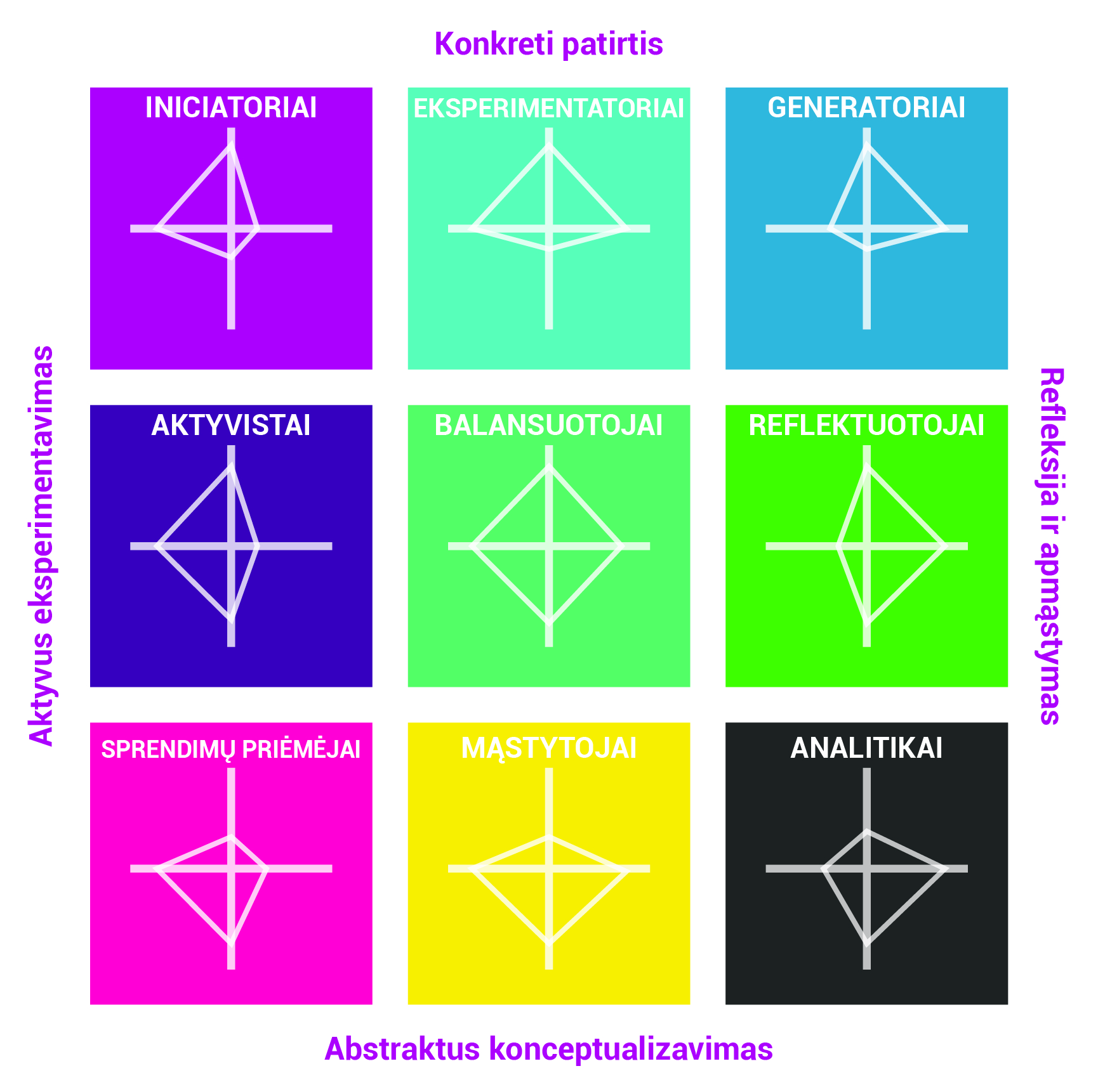 Kviečiame prisiminti ir įsivertinti patirtas keturias skirtingas stadijas: patirties, refleksijos, konceptualizavimo, veiksmų planavimo ir jas įsivertinti per pateiktus 9 mokymosi tipus. Kuris tipas artimiausias tau ir dėl ko?
